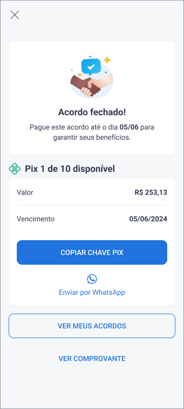 Ao fechar seu acordo, você deve realizar o pagamento de acordo com as condições definidas na etapa anterior. Para pagar com o Pix, clique em “Copiar chave Pix” e cole no aplicativo da instituição bancária para prosseguir.