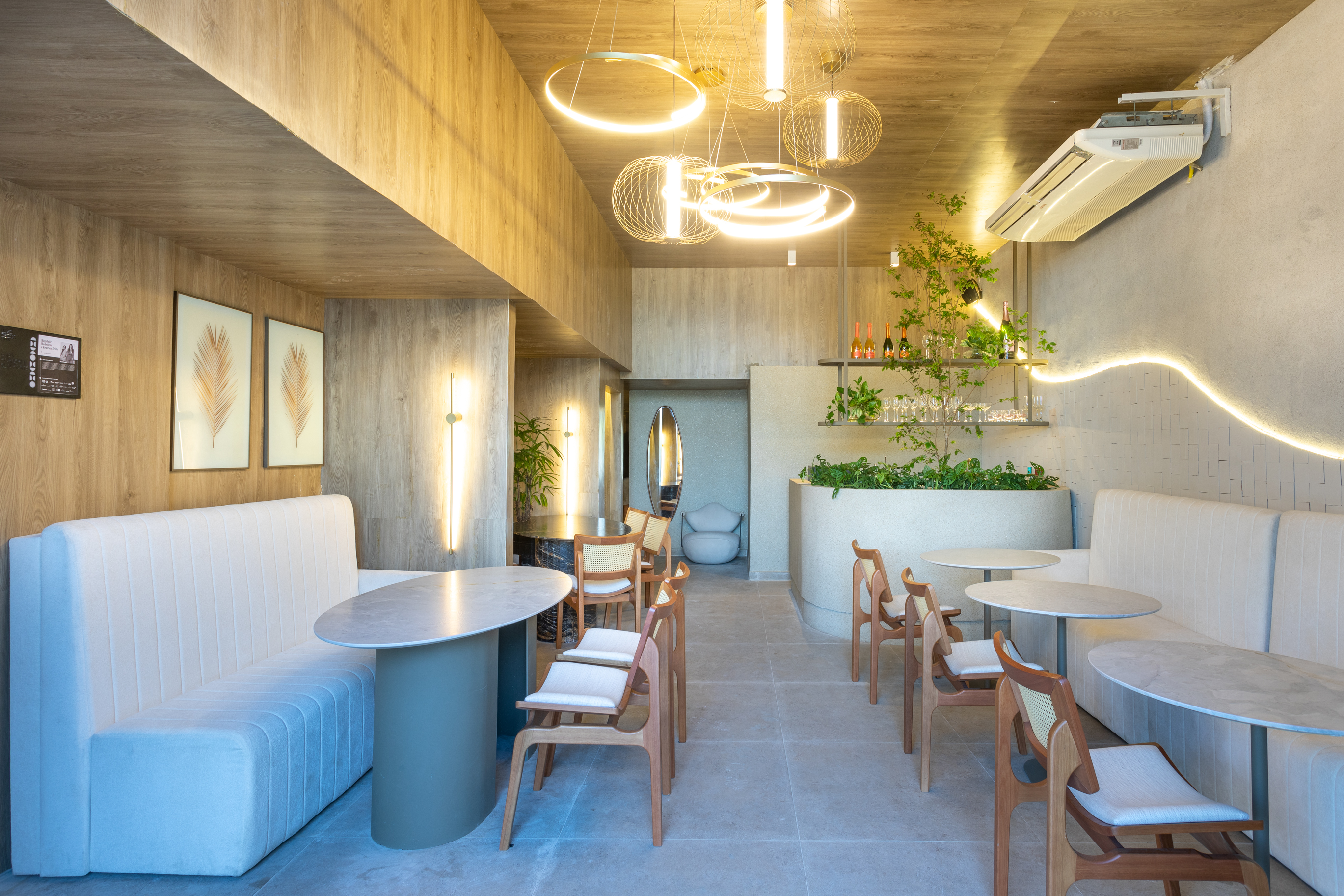 A estética minimalista conta com materiais, texturas e formas que remetem à natureza, aliada a paleta de cores que mescla tons de bege, off white e fendi no mobiliário. O vinílico amadeirado do teto e a textura de pó de pedra nas paredes e balcão do bar completam o conceito arquitetônico do espaço. “A intenção foi trazer conforto e sofisticação na medida certa”, contou.