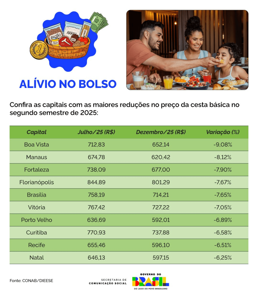 REGIÕES – Boa Vista lidera o cenário no Norte, assim como Fortaleza no Nordeste do país. Já no Centro-Oeste, Brasília é a recordista em declínio de preço da cesta, com variação de -7,65% nos últimos seis meses de 2025. No Sul, a capital mais bem colocada é Florianópolis, que teve redução de -7,67% no valor do conjunto de produtos. Por fim, Vitória (ES) é a capital vencedora no Sudeste do país, com redução de -7,05% no preço da cesta básica de alimentos no compilado das pesquisas da última metade do ano passado.