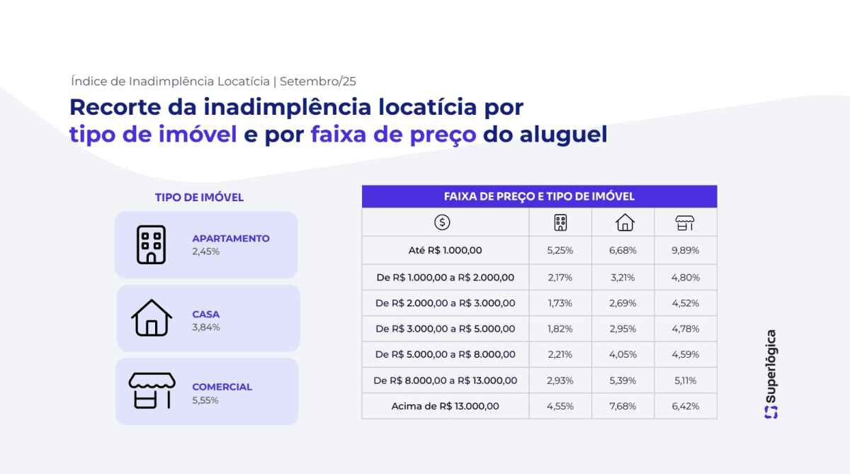 Entre a base analisada, a inadimplência em imóveis residenciais de alta renda (na faixa de aluguel acima de R$ 13.000) caiu depois de consecutivas altas desde maio de 2024, com uma taxa de 5,70%, contra 7,02% em agosto. Os imóveis residenciais na faixa de aluguel de até R$ 1.000 também registraram queda, saindo de 6,32% em agosto para 5,96%, mas representam a segunda maior taxa entre as faixas de valores. A taxa de inadimplência de imóveis de R$ 2.000 a R$ 3.000 e de R$ 3.000 a R$ 5.000 foram de 2,58% e 2,04%, respectivamente.