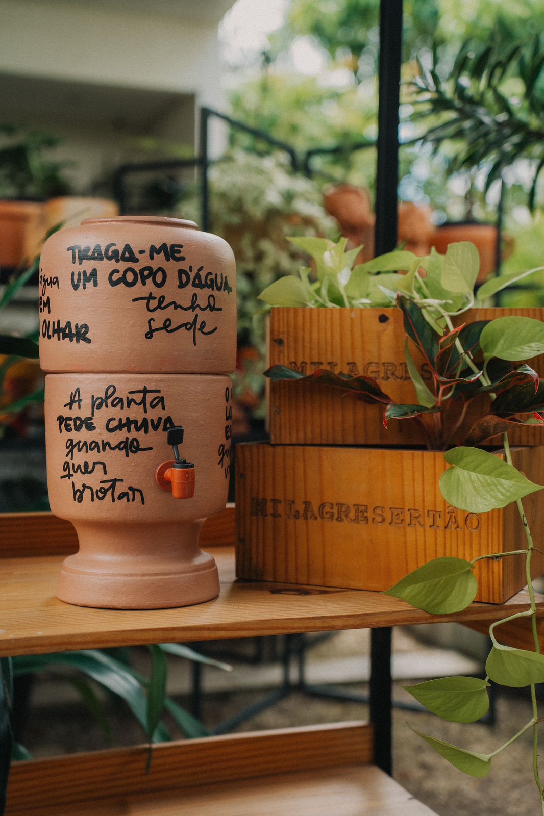 São os filtros de barro, que agora receberam a arte textual de Marcela Quirino, conhecida por suas “escritinhas” no Instagram. Os textos que tornam essas peças ainda mais especiais foram escolhidos da composição de Zé Neto para o projeto e destacam a riqueza cultural do Milagre Sertão. “Ainda não tinha trabalhado com o Milagre Sertão, mas já conhecia por meio de amigos envolvidos no projeto. Sempre admirei muito a iniciativa, por isso fiquei tão feliz com a proposta para fazer os filtros”, comentou Marcela.