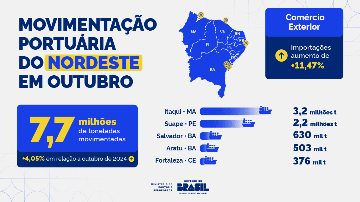 No comércio exterior, as importações registraram crescimento de 11,47%, evidenciando a importância dos portos nordestinos na movimentação de cargas essenciais para o abastecimento do mercado interno e para o fortalecimento das relações comerciais do Brasil com outros países.