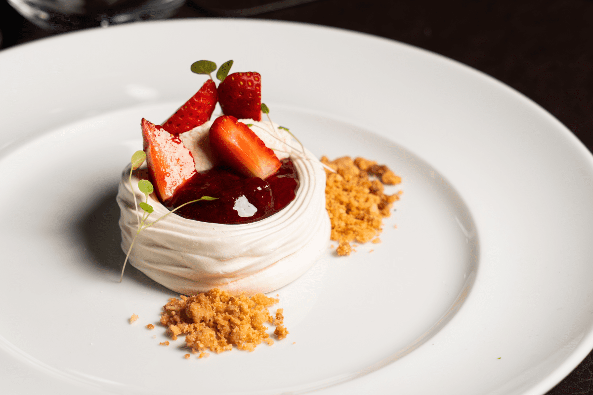 Para a sobremesa, o menu do NUI 360 oferece a Pavlova de Morango, composta por merengue de textura crocante por fora e macia por dentro, servida com compota de frutas vermelhas e morangos frescos, ou a Torta 100% Chocolate, feita com chocolate meio amargo, raspas de laranja Bahia e crème anglaise, clássico da confeitaria francesa que aporta cremosidade e contraste ao conjunto.
