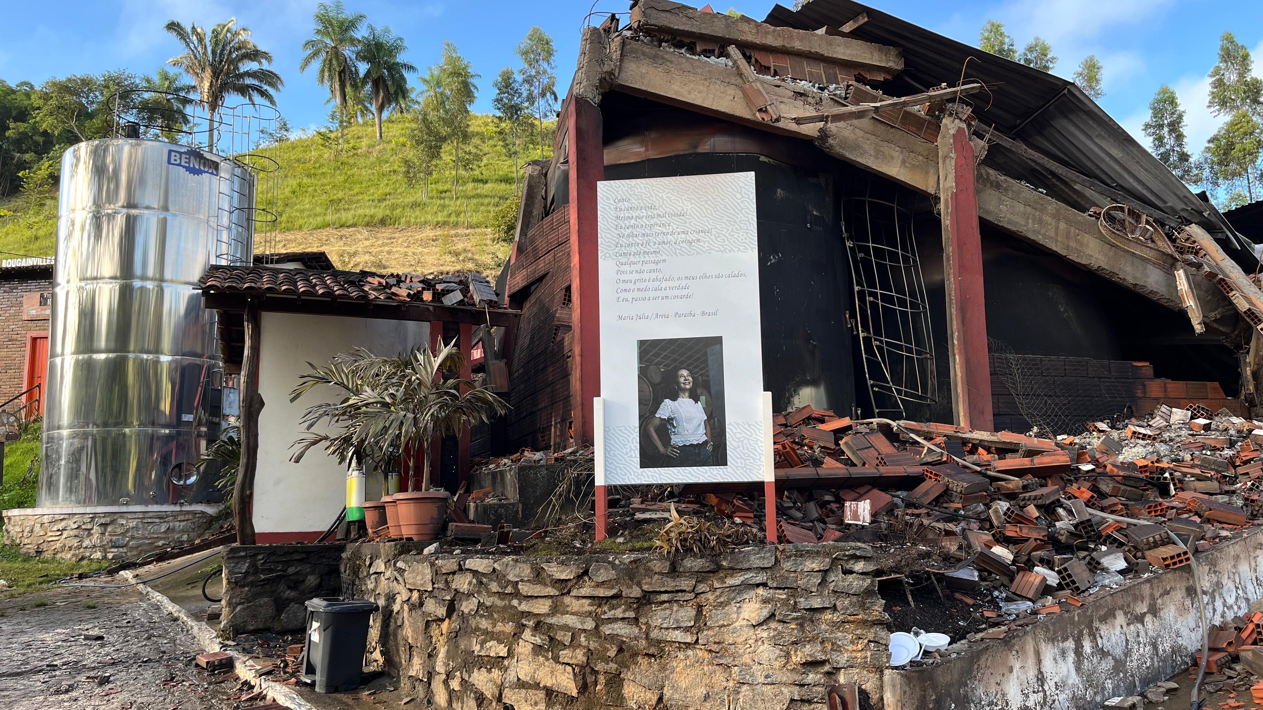 Um fato que chamou a atenção foi uma placa com uma foto de Maria Júlia Baracho, diretora executiva do Engenho, que trazia uma poesia. Foi a única a estrutura que se manteve de pé em frente so depósito atingido pelo fogo.
