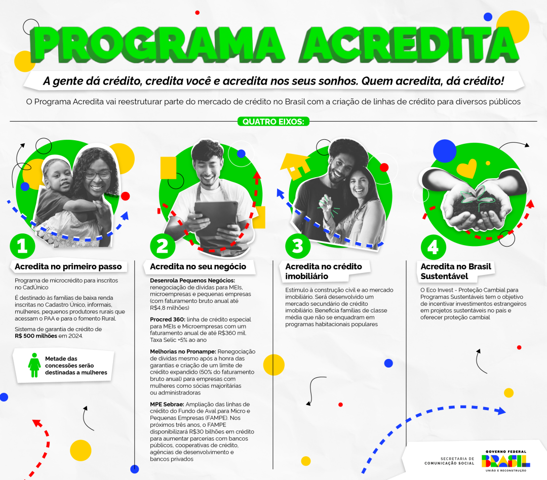 EIXOS – O Acredita está baseado em quatro eixos principais. O primeiro (Acredita no Primeiro Passo) é um programa de microcrédito para inscritos no CadÚnico. O segundo (Acredita no seu negócio) é voltado às empresas, por meio do Desenrola Pequenos Negócios e Procred 360. Há ainda uma frente que visa a criação do mercado secundário para crédito imobiliário. Por último, a aposta no Eco Invest Brasil – Proteção Cambial para Investimentos Verdes (PTE), que tem como objetivo incentivar investimentos estrangeiros em projetos sustentáveis no Brasil.