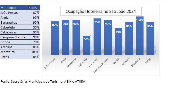 Na capital João Pessoa, a ocupação hoteleira alcança 87% com previsão de ocupação máxima em alguns hotéis durante o São João, conforme informações da ABIH. Enquanto isso, em Campina Grande, reconhecida por sediar o Maior e Melhor São João do Mundo, a taxa de ocupação atinge robustos 90%. Em Monteiro, no interior do Estado, a ocupação chega a impressionantes 100%, destacando o forte apelo turístico das festividades juninas na região.