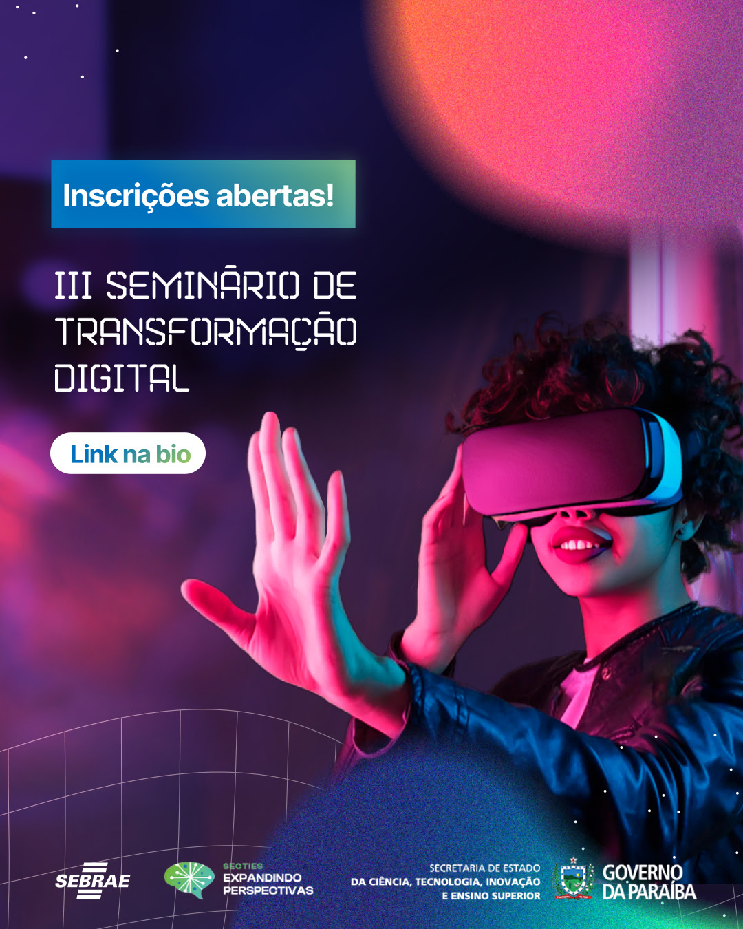 O Governo da Paraíba, por meio da Secretaria de Estado da Ciência, Tecnologia, Inovação e Ensino Superior (Secties), em parceria com o Sebrae-PB, realiza o III Seminário de Transformação Digital, que acontece nos próximos dias 21, 22 e 23 de fevereiro, no Intermares Hall, em Cabedelo. As inscrições estão abertas e podem ser realizadas por meio do site do evento, no link: https://secties.pb.gov.br/seminariodetransformacaodigital/.
